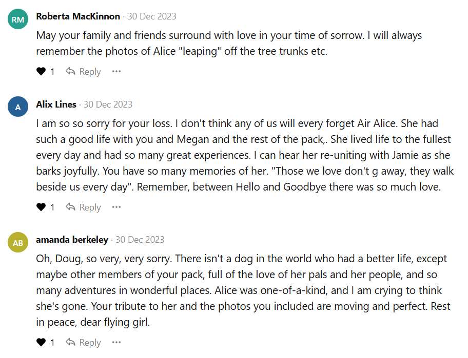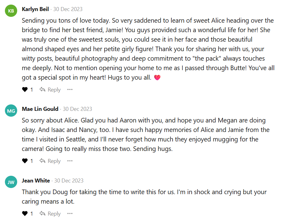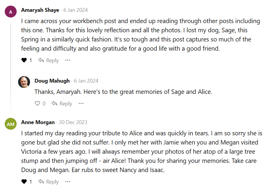 We'll get through it, and dogs always bounce back more quickly than humans, but it will take a while. Alice's final gift to Nancy and Isaac will be that they are going to start getting a lot more hikes and outings than they had in the last year. We no longer have to think about whether to leave Alice home alone, which means we can spontaneously do things we couldn't do before.
