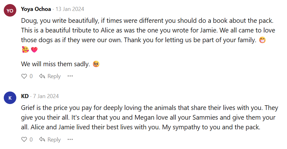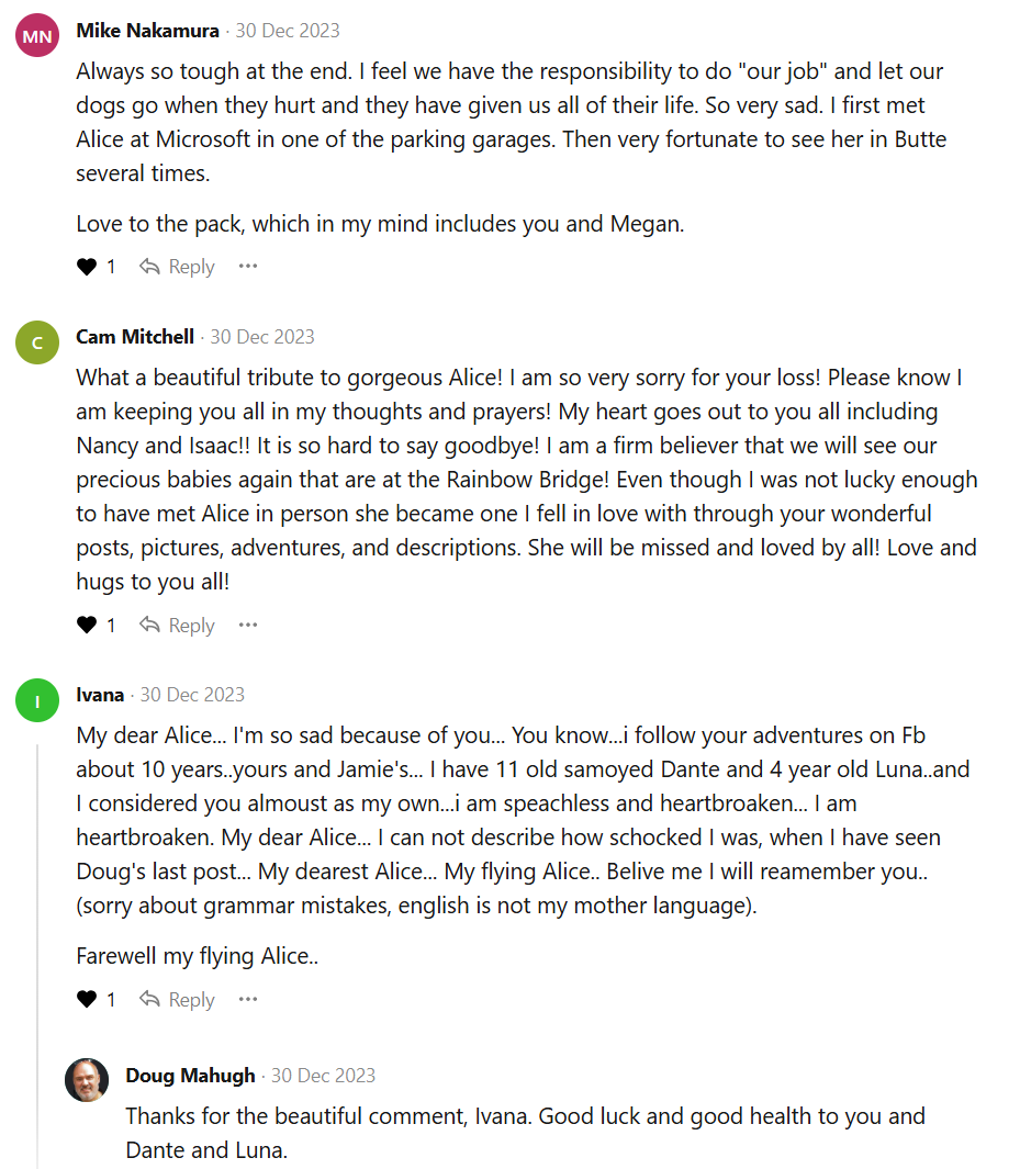 What a girl. I don't know how to talk about Alice without using superlatives. She was the greatest example I've ever known of simply embracing life and diving into every single day enthusiastically and fearlessly. Her death yesterday (December 29, 2023) was sudden and unexpected, but she lived longer than the average Samoyed and her life was full of joy and excitement.