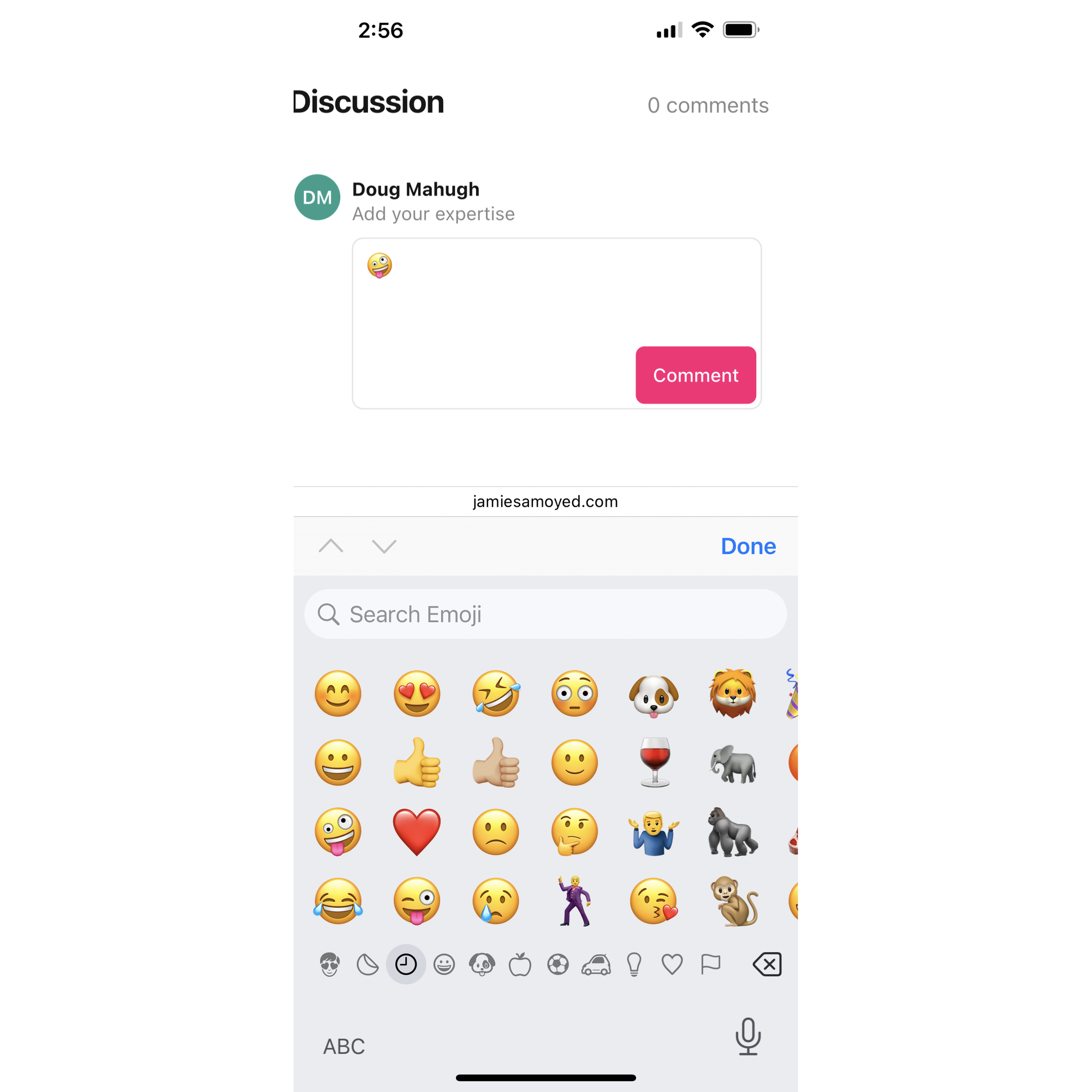 A comment can contain emojis, however, so you can add an emoji to a comment, or post a comment with just an emoji in it if you'd like. Just click the emoji icon on the lower left corner of your iPhone keypad.