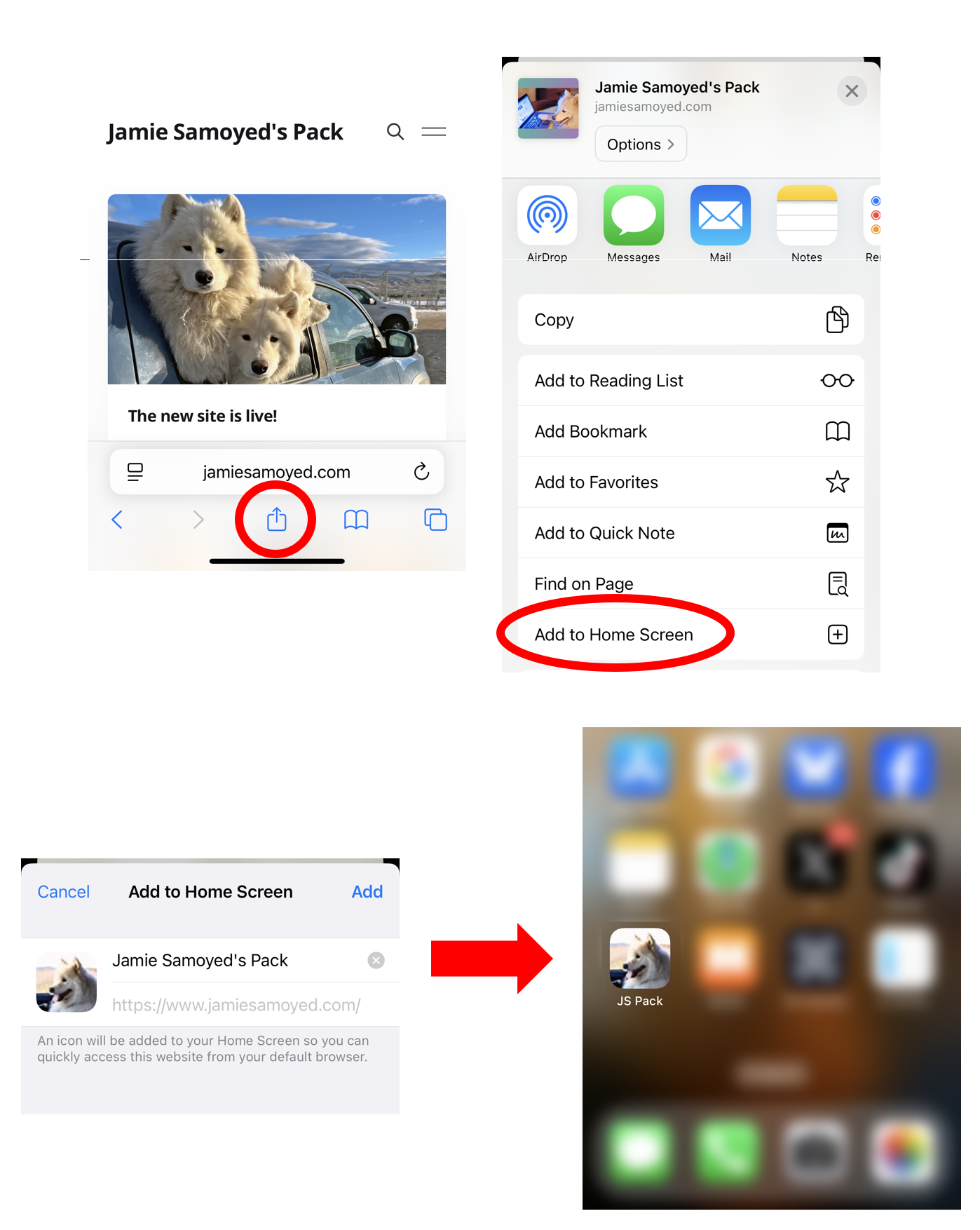 Any time you want to see what's new with Jamie's pack, you just need to visit JamieSamoyed.com and the latest posts will be at the top of the page. To make this process as quick and simple as possible, you may want to create a home screen icon that will take you to JamieSamoyed.com, so that you don't have to type that web address each time you visit the site.